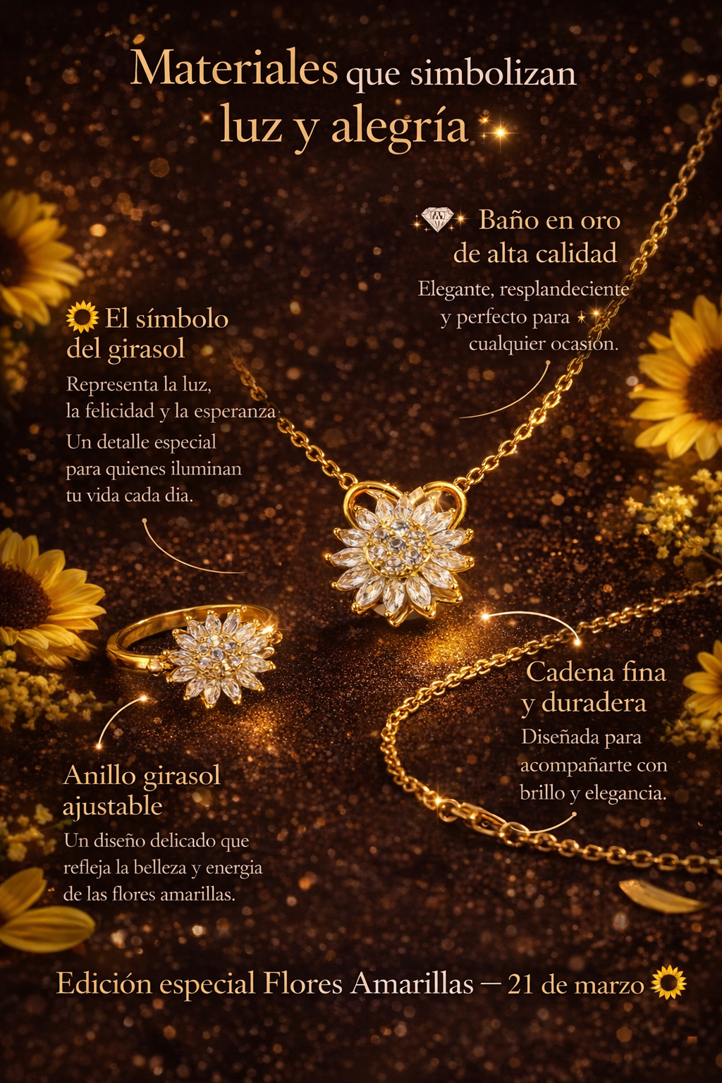 Nuestro Pack Girasol ALUNA, con collar y anillo bañados en oro de 18K, nace inspirado en ese significado. Un detalle especial para recordar que el amor verdadero, como los girasoles, siempre busca la luz 🌻✨.